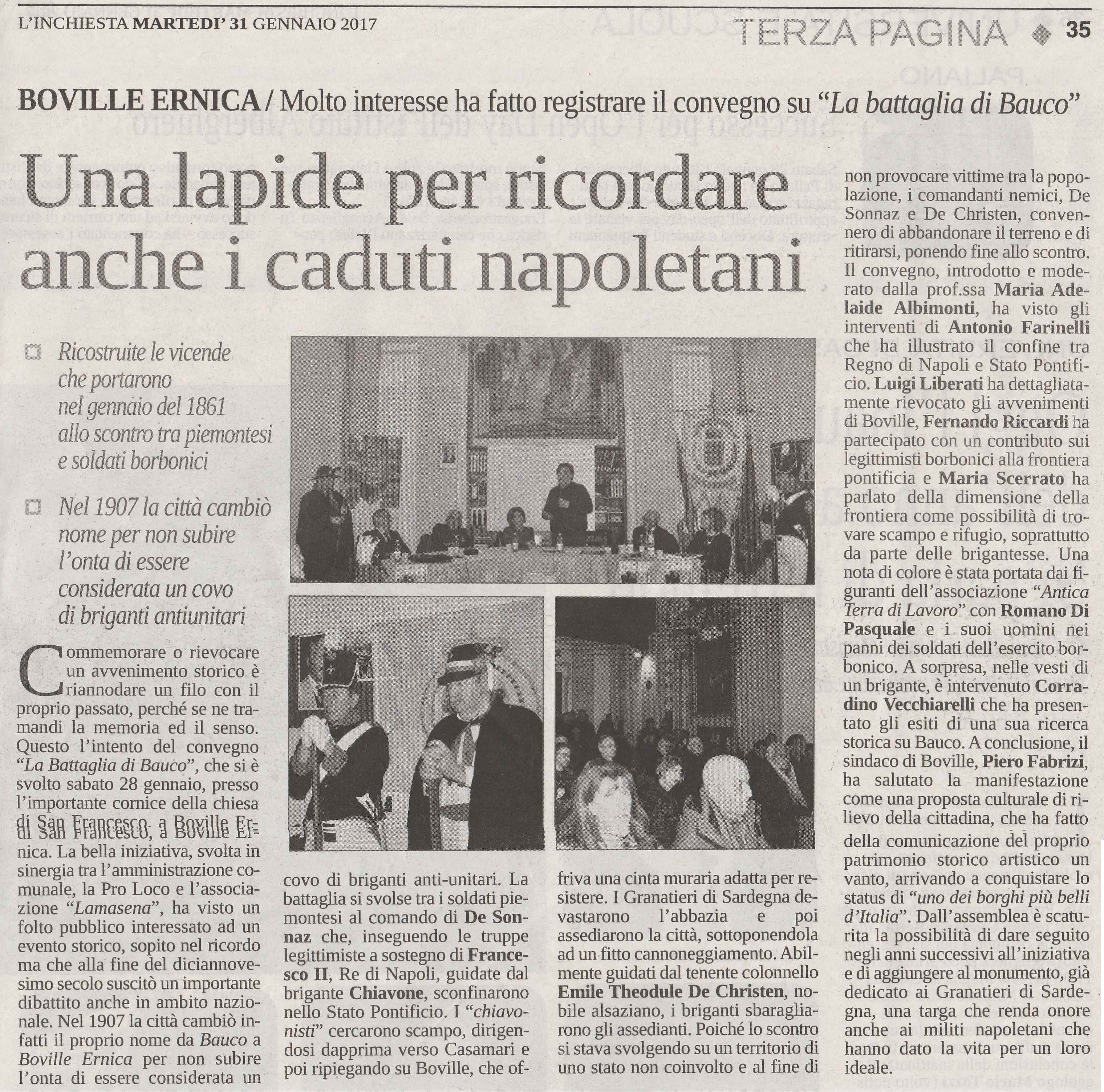 Articolo di stampa – pubblicato sul quotidiano “L’Inchiesta” – sul convegno tenutosi il 28 gennaio 2017 a Boville Ernica che ha rievocato “LA BATTAGLIA DI BAUCO“.